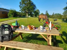 Vous êtes sportif mais ne dédaignez pas un bon repas? Découvrez nos produits du terroir lors de votre sortie à vélo en nature! Nous proposons un sac à dos brunch, que vous pouvez emporter jusqu’à une table de pique-nique pour déguster des produits fait maison dans cadre bucolique.